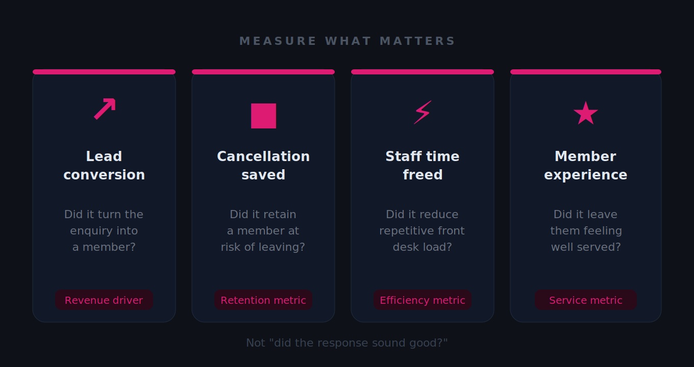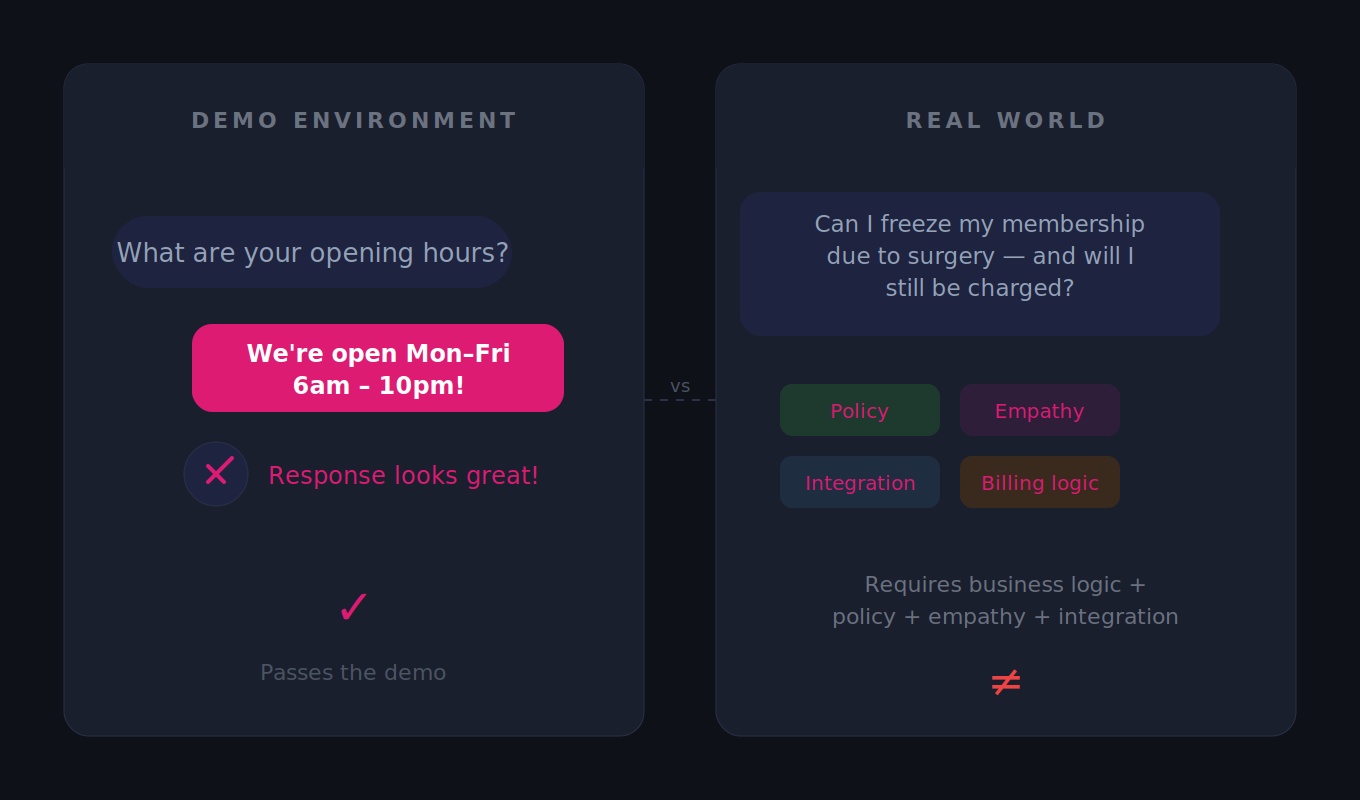 AI can often be tested around “What are your opening hours”, when the reality is that a real life question could be “Can I freeze my membership because of surgery and will I still be charged?”.that is a much more complex question! This shifts the focus from basic database knowledge to business logic + policy + empathy + integration.