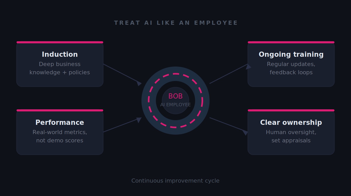 For these great outcomes to happen time after time, AI employees, as the name suggests, need to be treated like employees. Systems that claim to have a simple set up, and then “it’ll run on its own” will never deliver the best outcome. AI employees require a proper induction, ongoing training, performance tracking and clear ownership. Much like any employee, you need to give them the knowledge and support to do their job.
